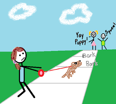 My mom was going to park in a parking lot away from most humans, but she missed the turn and we ended up parking by all of the playground equipment with easily a dozen squealing children. I was already thinking this was going to be bad and so did Sophie because she was already starting to freak out before my mom even put the car in park. As soon as we got out of the car, it started!
